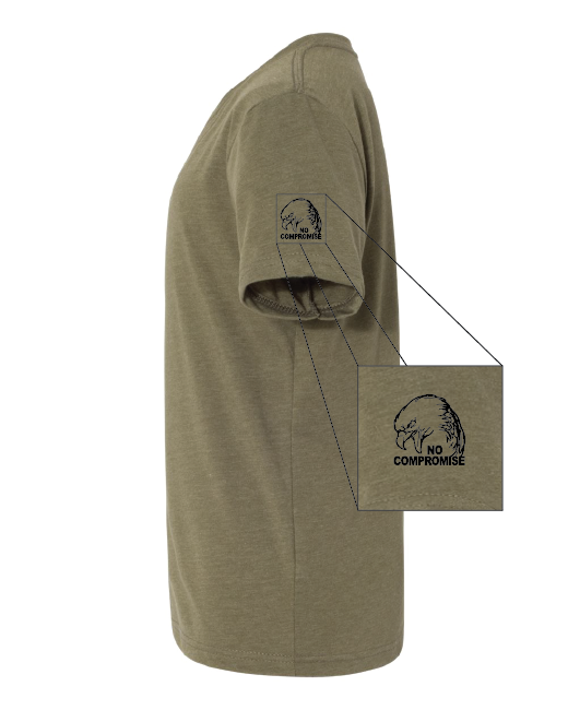 Printed on Next Level MIlitary Green CVC T-Shirts, made from a 60/40 combed ring-spun cotton/polyester blend. The fabric is comfortable for everyday wear, while also functioning well in high activity.